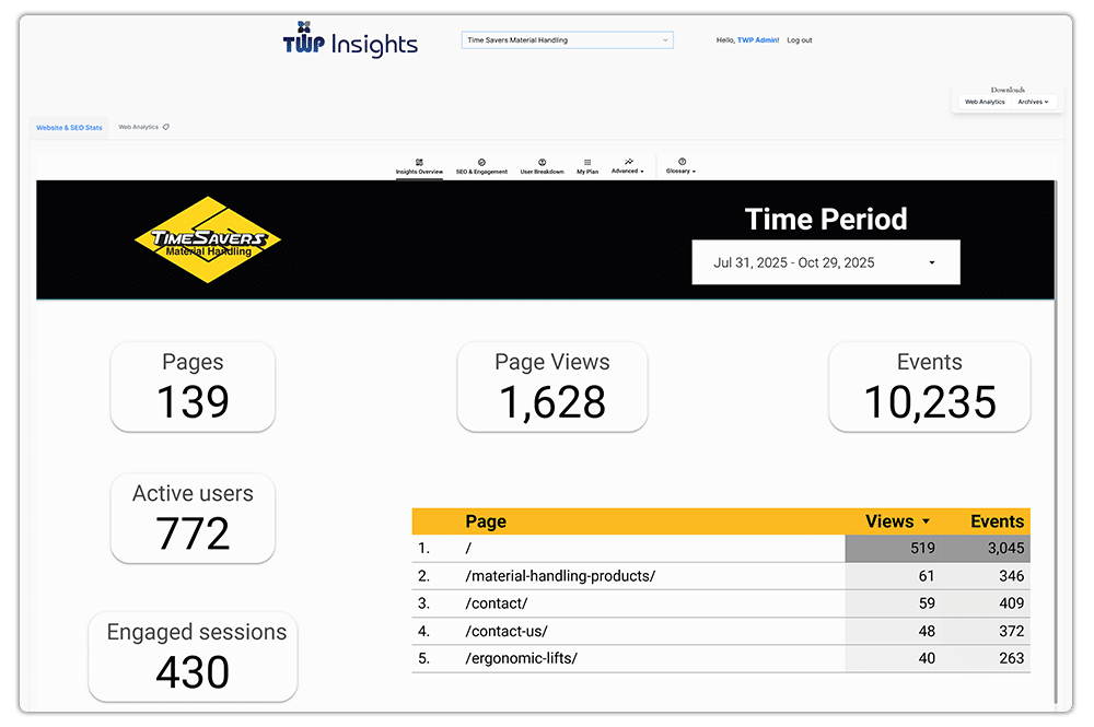 From 2018’s data-driven launch to 2025’s SEO expansion and real-time analytics, TWP has provided a complete, low-effort, high-impact digital strategy that continues to grow with the business. As we look to the future, TWP will closely monitor TimeSavers Material Handling’s site, to innovate when needed, and to find ways to continuously provide next level opportunities as they arise.
