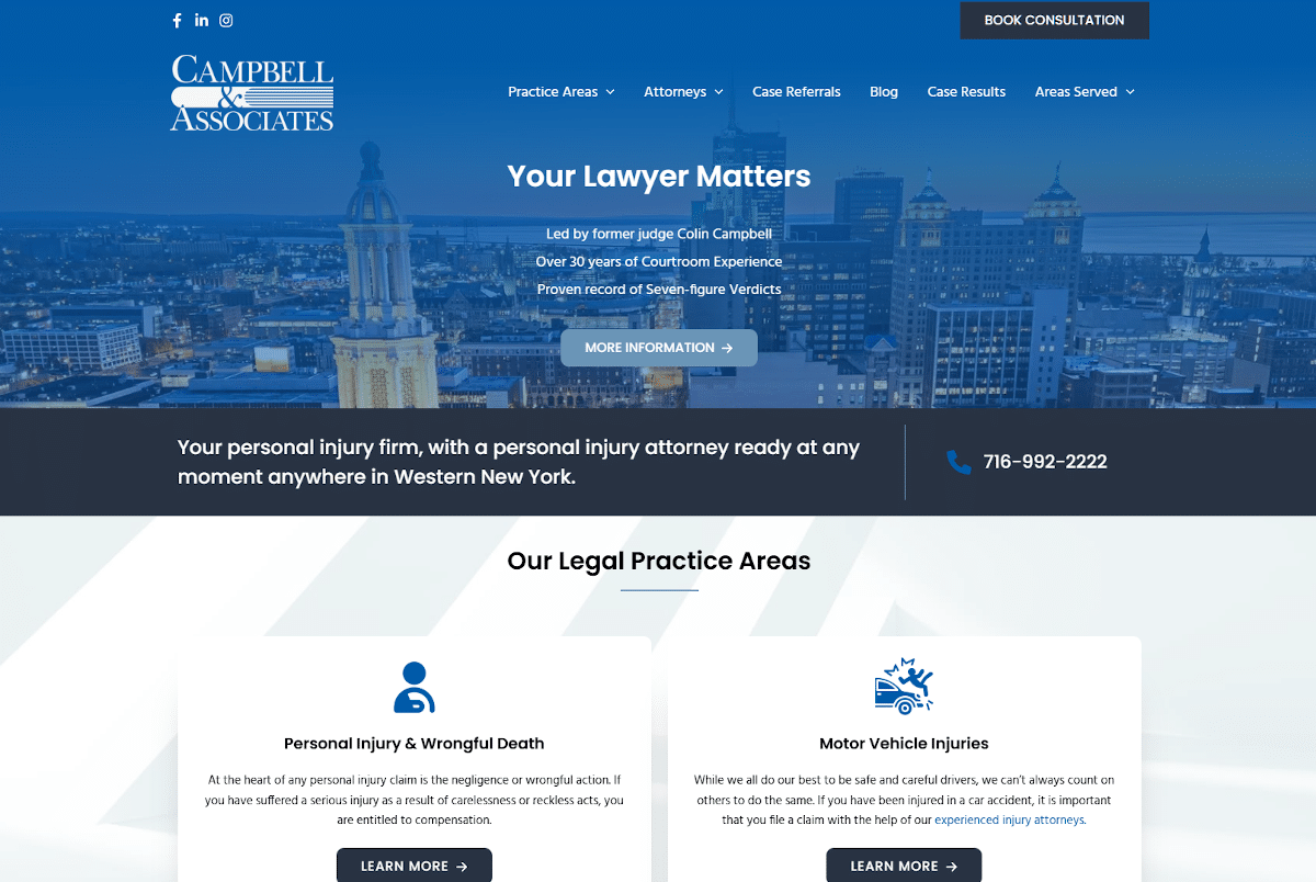 TotalWeb Partners (TWP) partnered with Campbell & Associates Personal Injury Law, a prominent Buffalo-based law firm, to enhance their online presence and attract new clients through an updated website, syndicated content, and a robust paid ads campaign.